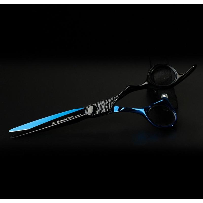 Kadeřnické nůžky MR. MUSTACHE Craft Black-Blue – nástroj pro opravdové mistry řemesla. Preciznost, síla a styl v každém střihu.